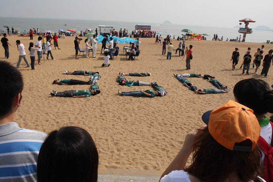 2009年10月24日,當(dāng)日是350全球應(yīng)對(duì)氣候變化行動(dòng)日,世界各地的民眾紛紛用自己的方式來(lái)表示對(duì)全球氣候變化的關(guān)注和擔(dān)憂。圖為中國(guó)廣東珠海海濱泳場(chǎng),大學(xué)生進(jìn)行海灘辦公的行為藝術(shù)。鐘凡 攝