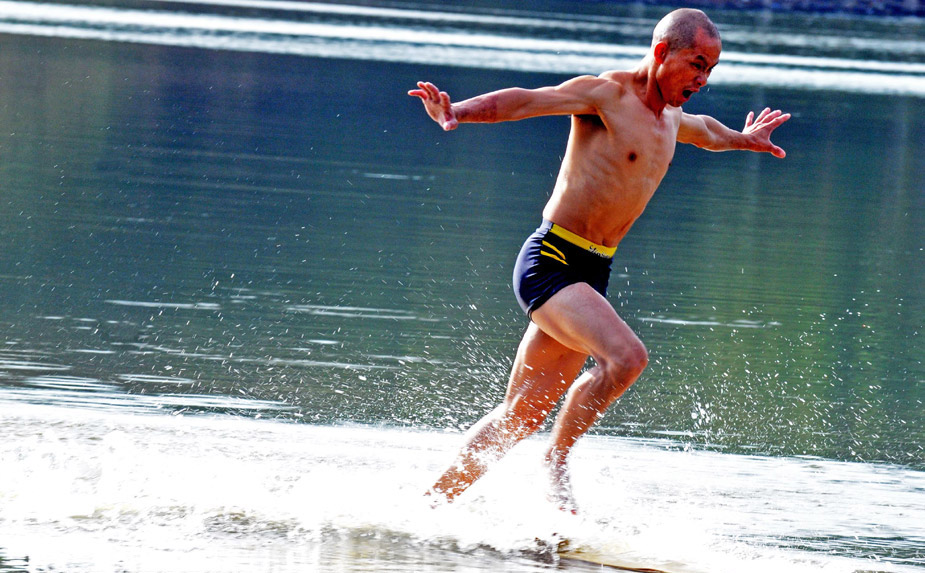 泉州南少林武僧釋理亮借助三合板上演少林絕技“水上漂”,在水面“飛奔”了18米遠(yuǎn)。那么,釋理亮的“水上漂”功夫是如何練成的呢?