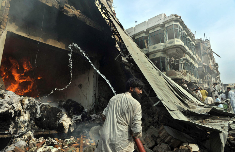 10月28日,巴基斯坦西北部城市白沙瓦一個(gè)人口密集的集市遭汽車炸彈襲擊。圖片來源:中國新聞網(wǎng)
