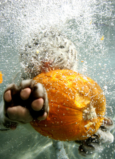 10月28日,美國(guó)加利福尼亞州Vallejo,六旗探索王國(guó)游樂(lè)園里的孟加拉虎在水下撕咬萬(wàn)圣節(jié)南瓜,還用虎掌擋鏡頭拒拍“耍大牌”。