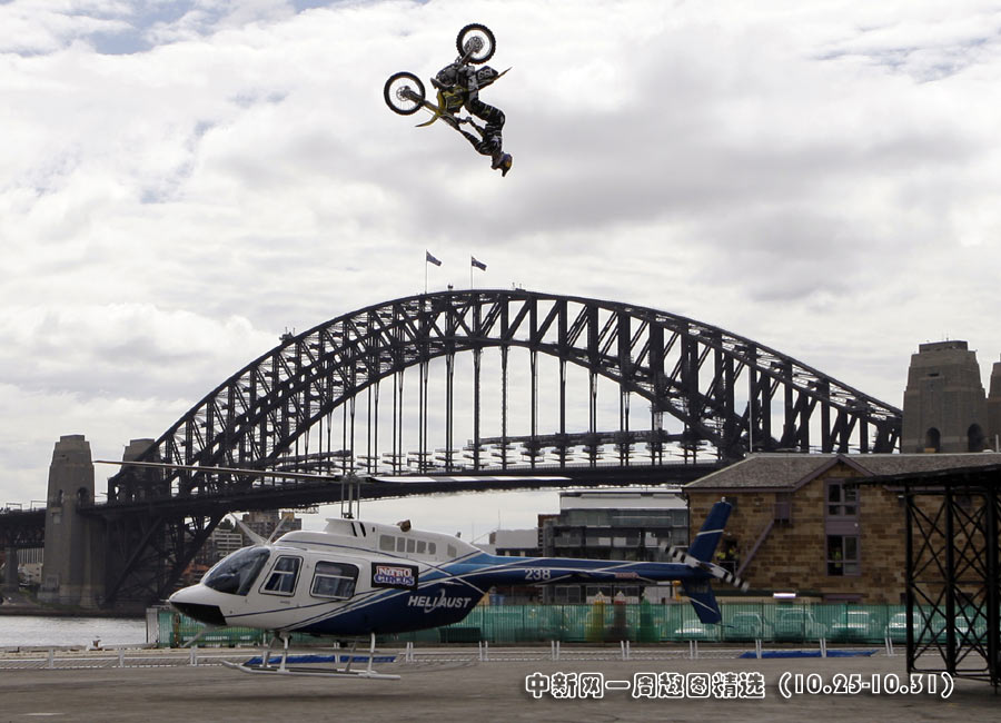 10月28日,在澳大利亞悉尼著名的港灣大橋附近,美國人特拉維斯·帕斯切拉駕駛摩托車成功從一架盤旋的直升機(jī)上空飛過。特拉維斯是一位著名的極限運(yùn)動(dòng)玩家,此次是為一個(gè)電視節(jié)目做推廣。>>點(diǎn)擊觀看詳細(xì)內(nèi)容