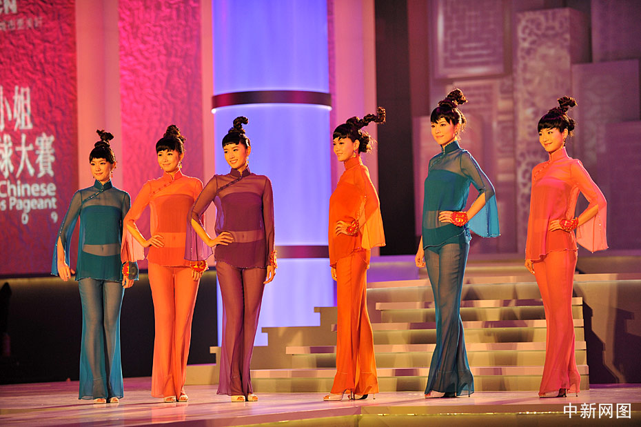 10月31日晚,“2009中華小姐環(huán)球大賽”總決賽上,12名入圍總決賽的佳麗身著各式服裝展現(xiàn)曼妙身姿,此外大賽還設計了一套“廢品服裝”呼吁環(huán)境保護。中新網(wǎng)記者 金碩 攝