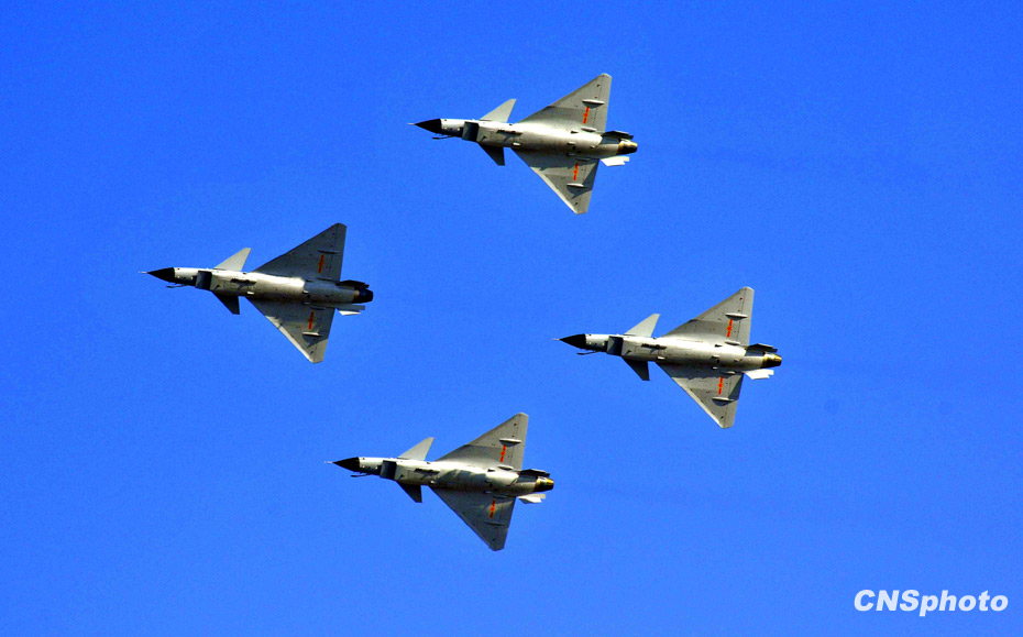 十一月三日,為迎接十一月十一日中國人民解放軍空軍建軍六十周年,空軍八一飛行表演隊(duì)和空軍八一跳傘隊(duì)在北京沙河機(jī)場舉行了精彩的預(yù)演。圖為殲十戰(zhàn)機(jī)方隊(duì)。 中新社發(fā) 潘旭臨 攝