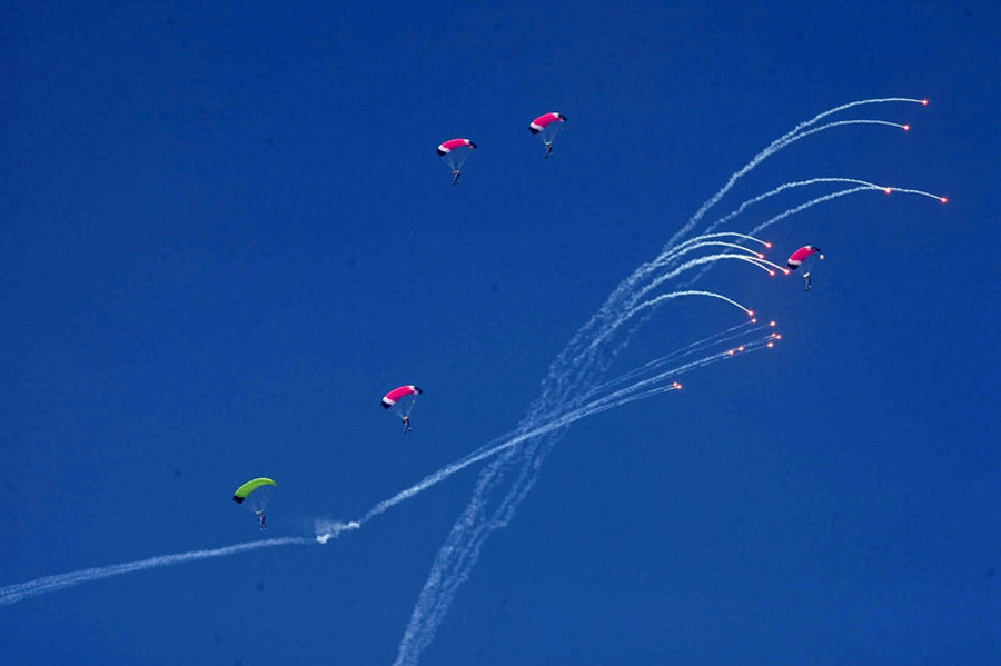 11月3日,空軍八一飛行表演隊(duì)和空軍八一跳傘隊(duì)在北京沙河機(jī)場舉行預(yù)演,迎接中國人民解放軍空軍建軍六十周年。