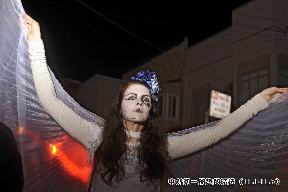 11月2日,美國(guó)舊金山居民扮成鬼怪模樣慶!巴鲮`節(jié)”。>>點(diǎn)擊觀看詳細(xì)內(nèi)容
