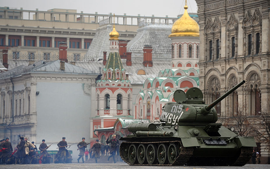 11月7日,俄羅斯士兵身穿二戰(zhàn)時期的軍服在莫斯科紅場舉行閱兵閱兵式紀念1941年紅場閱兵。圖片來源:中國新聞網