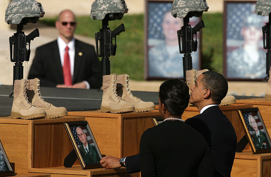 2009年11月10日,美國德克薩斯州胡德堡陸軍基地舉行儀式悼念槍擊案遇難者。美國總統(tǒng)奧巴馬和第一夫人米歇爾出席。 圖片來源:中國新聞網(wǎng)