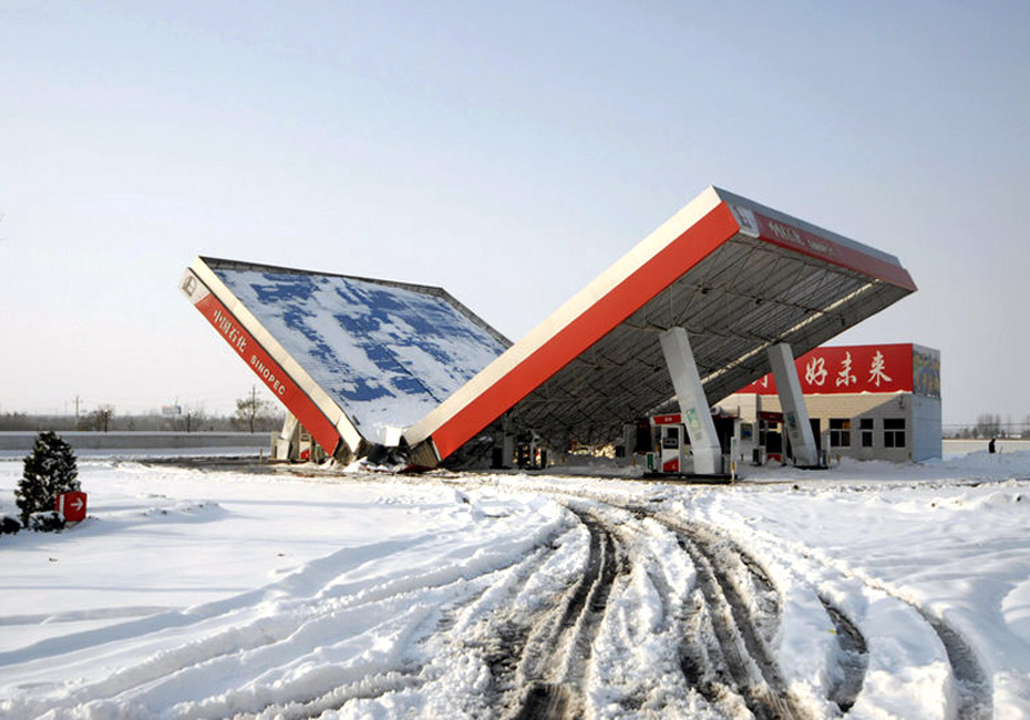 11月12日,在山西省長陵公路長治市郊區(qū)段,一加油站被大雪壓塌。姚林 攝