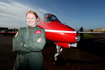 圖為紅箭飛行表演隊首位女飛行員基絲·摩爾中尉與她的飛機。
