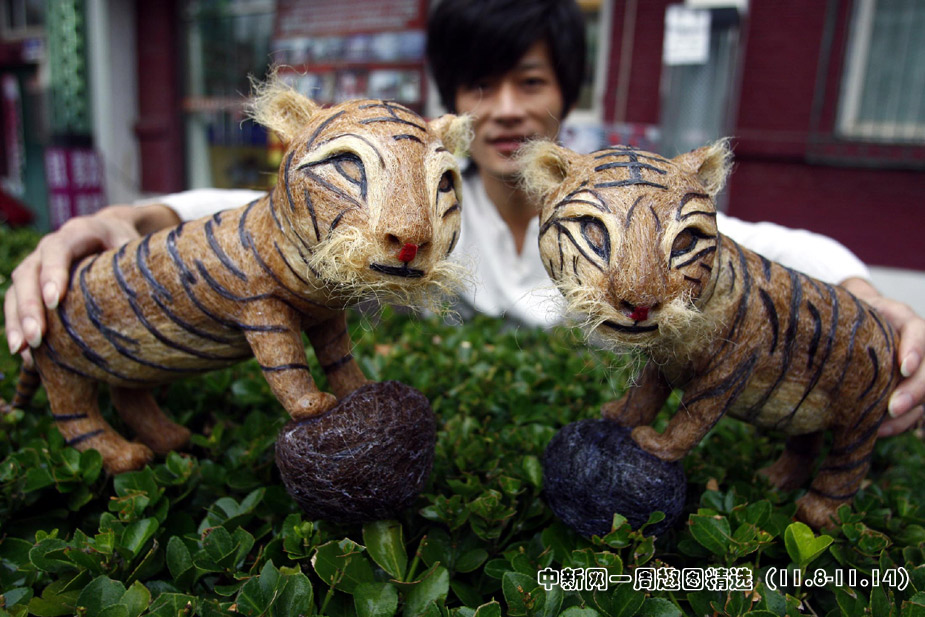 11月9日,北京一位時尚發(fā)型設(shè)計師正在展示頭發(fā)絲作品“福虎神威”賀歲虎年。這是祖國60華誕之后的又一新作,四川青年理發(fā)師黃鑫用2.6公斤碎頭發(fā)制作了一對可愛逼真的“;ⅰ,歷時兩個多月的時間才完工。>>點擊觀看詳細內(nèi)容