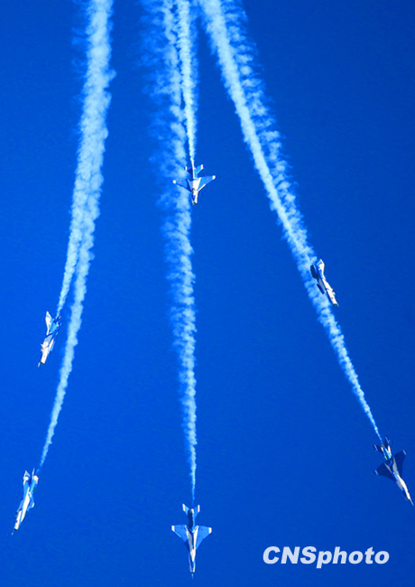 慶祝中國人民解放軍空軍成立60周年飛行表演,11月15日上午在北京沙河機(jī)場舉行。表演按八一飛行表演隊4架殲-10飛機(jī)表演12個動作和6架殲-7GB飛機(jī)表演15個動作,分四機(jī)對頭交叉、四機(jī)菱形隊大坡度盤旋、單機(jī)小速度平飛等27個動作,其中四機(jī)對頭交叉動作是這次表演中技術(shù)難度較大的動作之一,這是國產(chǎn)三代飛機(jī)和國產(chǎn)二代飛機(jī)首次同場競技表演。圖為殲-7GB表演六機(jī)向下開花。中新社發(fā) 宋吉河 攝
