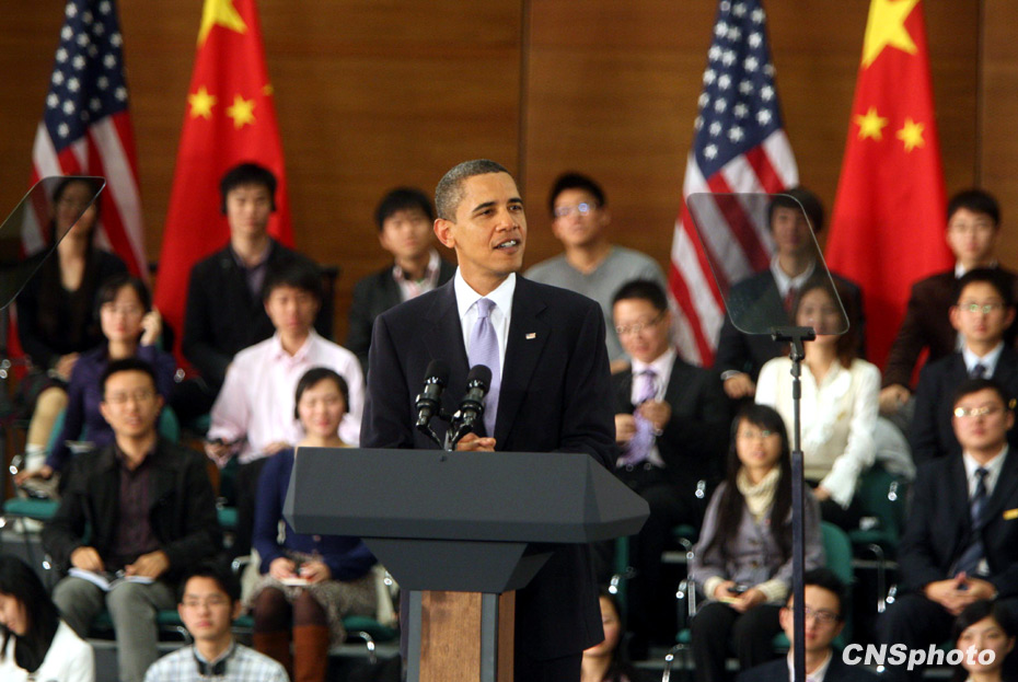 11月16日,正在上海訪問的美國總統(tǒng)奧巴馬現(xiàn)身位于浦東的上?萍拣^,與四百余中國青年進行面對面交流。 圖片來源:中國新聞網(wǎng)