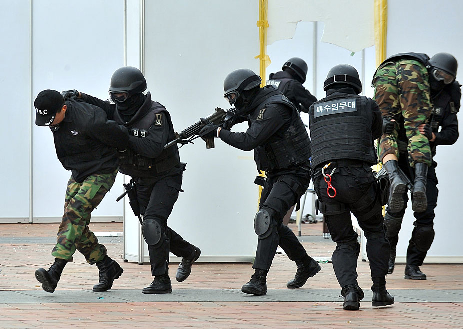 11月16日,韓國(guó)在距首爾以北30公里處舉行了由特種兵參與的反恐演習(xí)。圖片來(lái)源:中國(guó)新聞網(wǎng)