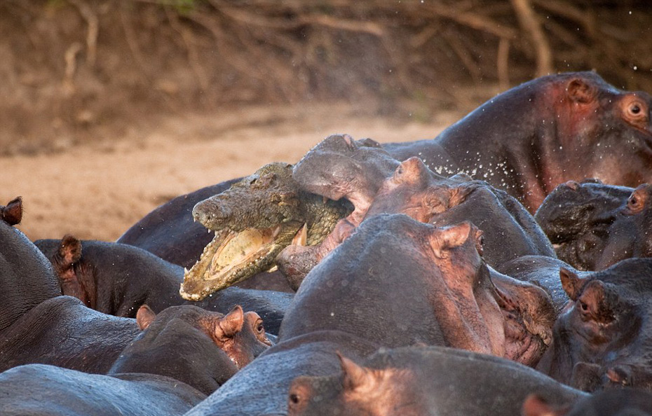 一條鱷魚悄悄混入了正在河里洗澡的河馬中,它很快就被敏感的母河馬發(fā)現(xiàn)。憤怒的河馬們立刻對它發(fā)起了猛烈地攻擊,這條冒失的鱷魚很快死于非命。