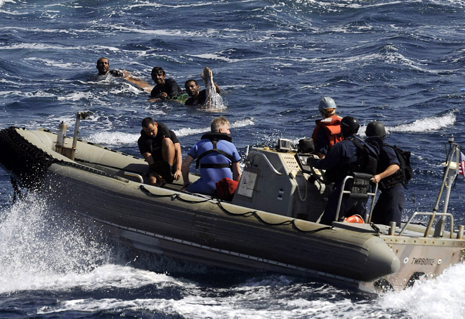 11月17日,亞丁灣,3名漁民抱著木板在海面上漂流3天后獲救。據(jù)悉,他們遭遇了十幾名名疑似海盜的劫持,海盜們讓其選擇或跳海逃生或被殺死。圖片來源:中國新聞網(wǎng)