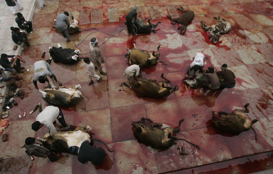 11月28日,世界各國(guó)的穆斯林迎來傳統(tǒng)節(jié)日“宰牲節(jié)”。圖為巴基斯坦的穆斯林在宰牲節(jié)上宰殺牲畜。