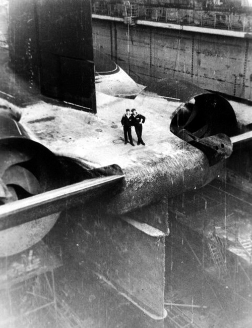圖為兩名水兵站在“臺風”碩大無比的尾部。圖片來源:人民網(wǎng)