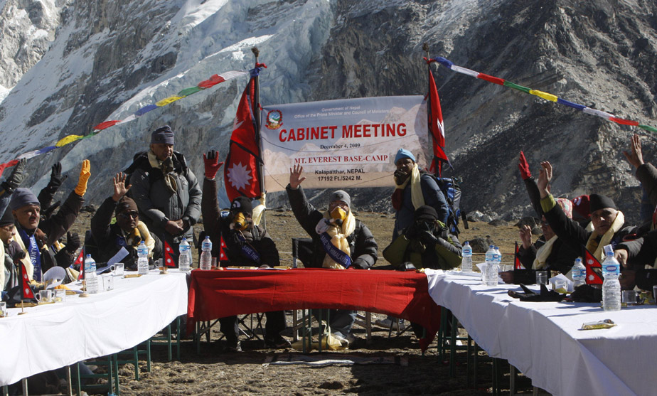12月4日,尼泊爾總理和22位部長在喜馬拉雅山海拔5262米的高度舉行內(nèi)閣會(huì)議,討論全球變暖對喜馬拉雅山的影響。呼吁人們切實(shí)采取行動(dòng),保護(hù)環(huán)境。