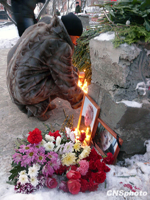 十二月六日,在俄羅斯彼爾姆市夜總會火災(zāi)事故現(xiàn)場,一位俄羅斯婦女點燃蠟燭,悼念自己的親人。中新社發(fā) 田冰 攝
