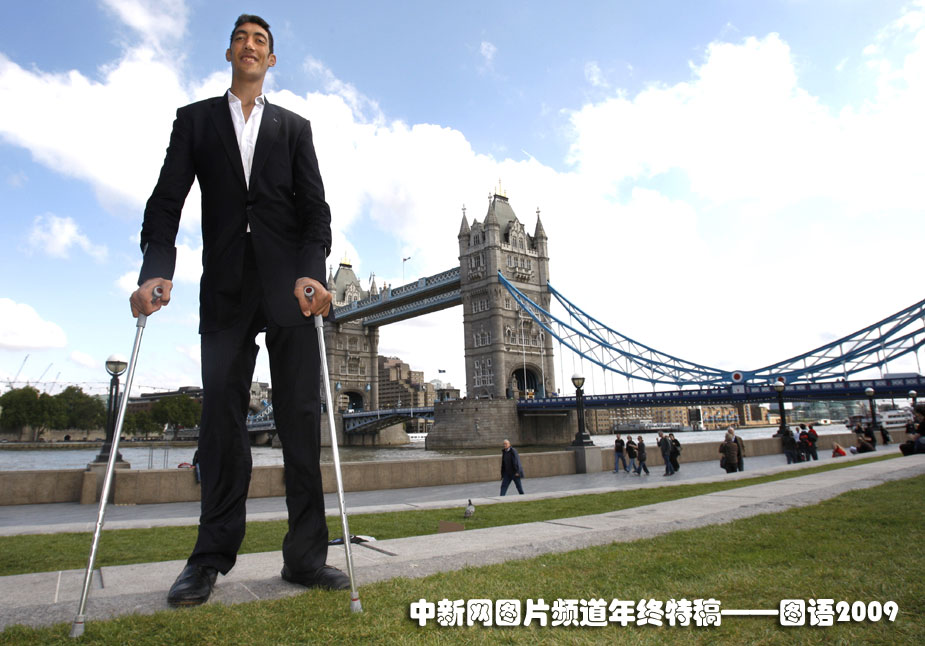 世界最高的人:9月16日,在英國倫敦泰晤士河傍的塔橋附近,身高2.46米的土耳其農(nóng)民蘇丹·古錢加冕吉尼斯世界紀(jì)錄“世界最高人”桂冠。圖片來源:中國新聞網(wǎng)