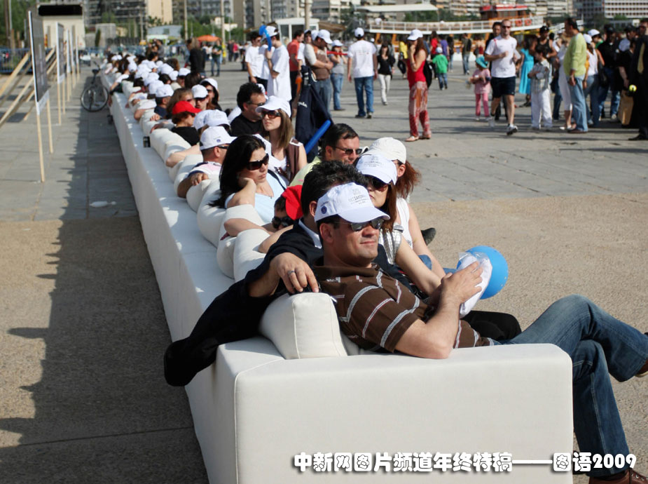 世界最長的沙發(fā):5月9日,希臘在塞薩洛尼基展示了一個(gè)64.75米的沙發(fā)。打破吉尼斯最長沙發(fā)的紀(jì)錄。圖片來源:中國新聞網(wǎng)