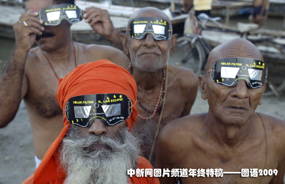 7月22日,印度教眾戴著觀測(cè)眼鏡在戶外觀測(cè)日食奇觀。