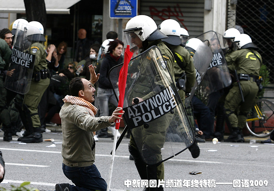 12月6日,一名抗議者在警察面前下跪。雅典警察開槍打死一名15歲少年事件一周年,希臘各地舉行悼念活動和爆發(fā)游行示威。