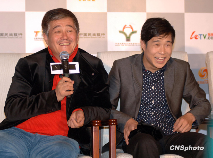 12月9日下午,張藝謀喜劇新作《三槍拍案驚奇》在京舉行首映發(fā)布會(huì),導(dǎo)演張藝謀、大病初愈的趙本山攜孫紅雷、小沈陽、閆妮、倪大洪、程野、毛毛全明星主創(chuàng)團(tuán)隊(duì)齊齊亮相。現(xiàn)場張藝謀、趙本山、小沈陽搞笑不斷,引得爆笑連連,上演了一出戲外喜劇。趙本山首度回應(yīng)了花兩億購買私人飛機(jī)一事,稱還沒有定下來。張藝謀表示會(huì)和“趙家班”繼續(xù)深度合作,并且豪言預(yù)計(jì)未來的中國電影單部影片票房可能達(dá)到2億美元。圖為張藝謀、趙本山、小沈陽成為“笑彈”。中新社發(fā) 李學(xué)仕 攝