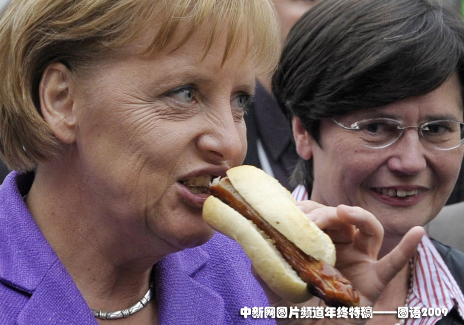 美食的誘惑:2009年9月27日,德國總理默克爾在德國東部愛爾福特市訪問時,大吃香腸。