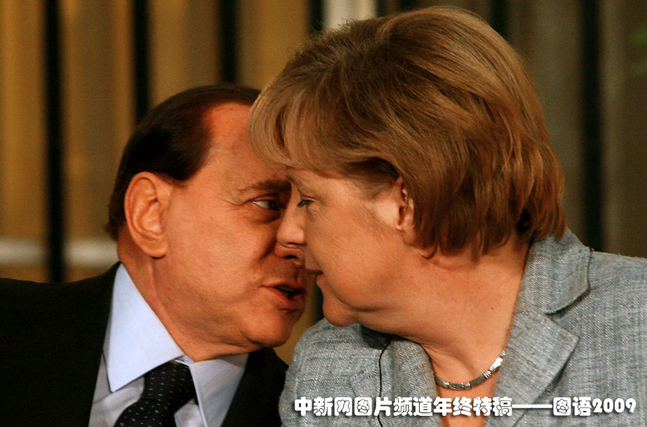 貝魯斯科尼與默克爾親密交談:2009年1月18日,以色列總理奧爾默特舉行記者發(fā)布會宣布;饡r,意大利總理貝盧斯科尼(左)和德國總理默克爾親密交談。