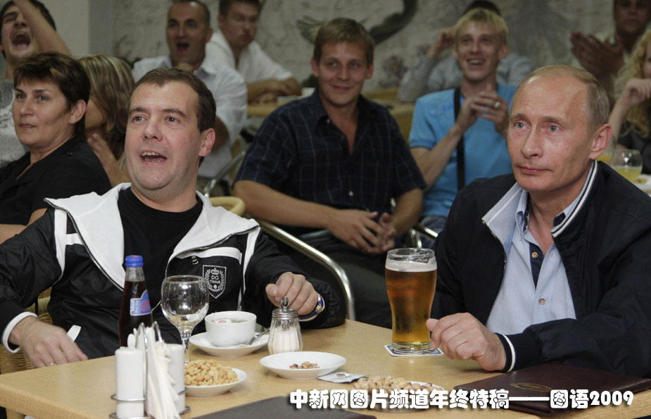 兄弟同樂(lè):2009年8月12日,俄羅斯總統(tǒng)梅德韋杰夫、總理普京在一家咖啡廳里觀看了俄羅斯與阿根廷足球友誼賽的電視直播。