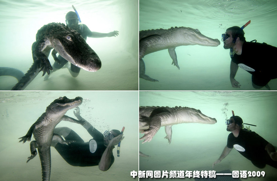 在美國佛州叢林島動(dòng)物主題公園,男子與一條美洲鱷在水下上演“人鱷共舞”。