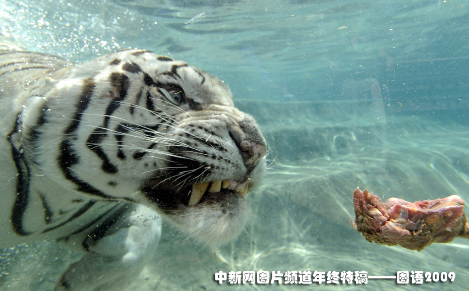 美國加利福尼亞,一只名叫奧丁的雄性孟加拉大白虎在水中“覓食”。它不僅一點(diǎn)也不怕水,而且出眾的游泳技能聞名。