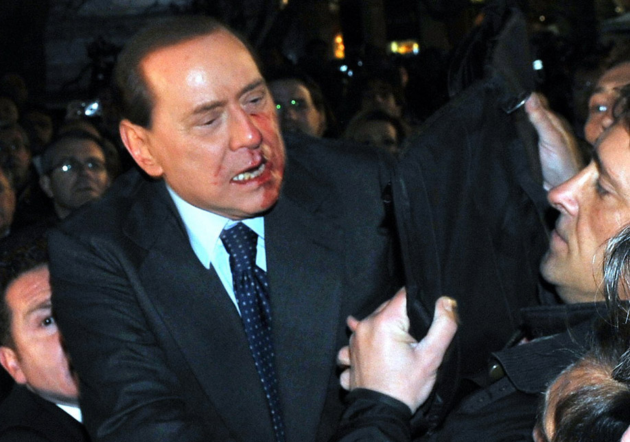 時(shí)值政治盟友沖刺階段,貝盧斯科尼照例參加自己黨派的集會(huì)。就在他給支持者簽名時(shí),人群中一名中年男子突然毆打其面部。當(dāng)?shù)仉娨暸_(tái)畫面顯示,跌倒在地的貝盧斯科尼被助手扶起時(shí),口鼻出血,面部淤青,表情痛苦。