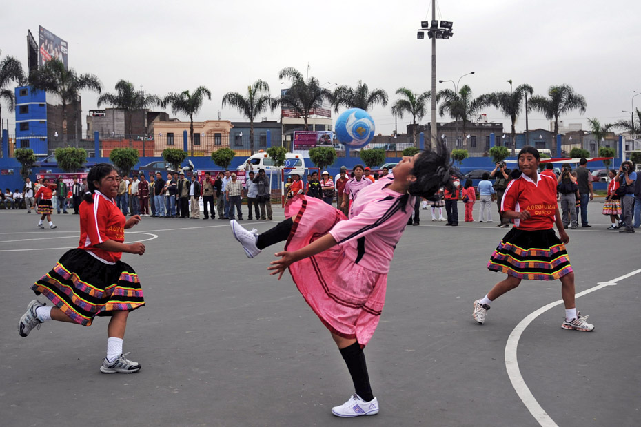 12月12日,秘魯印第安婦女在利馬國家體育場外舉辦了一場特別的足球賽,所有的球員均身著傳統(tǒng)服飾光腳上陣妙趣橫生。圖片來源:中國新聞網(wǎng)