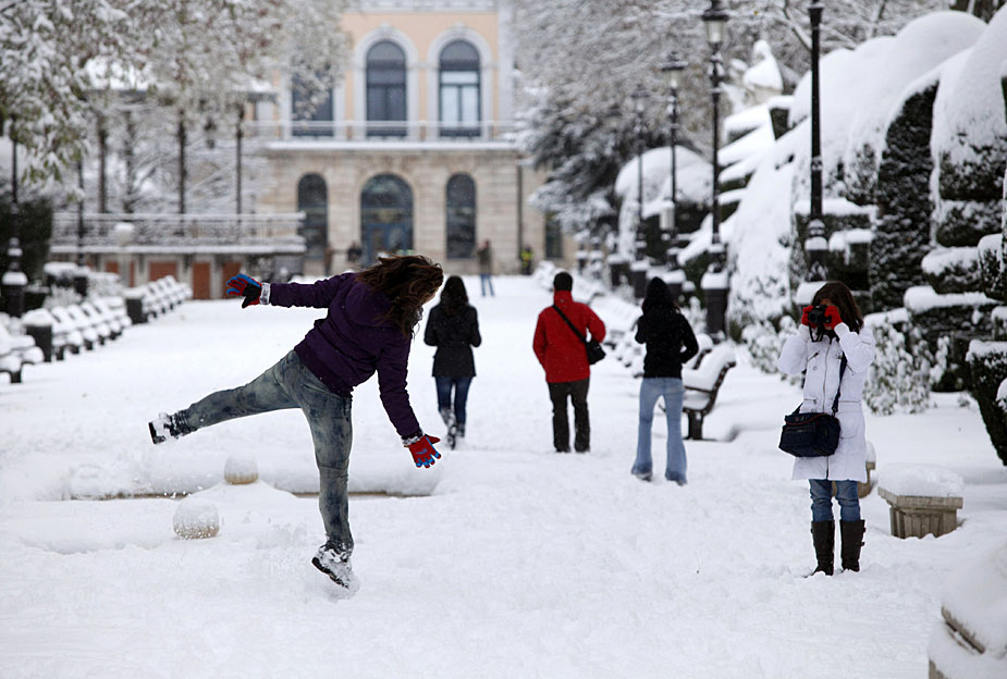 12月17日,西班牙布爾戈斯人們在雪中拍照留念。