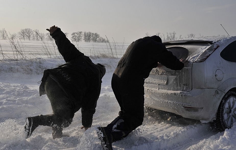 圖為12月20日,匈牙利首都布達佩斯西部的公路上,人們正從積雪中將拋錨的汽車推出。