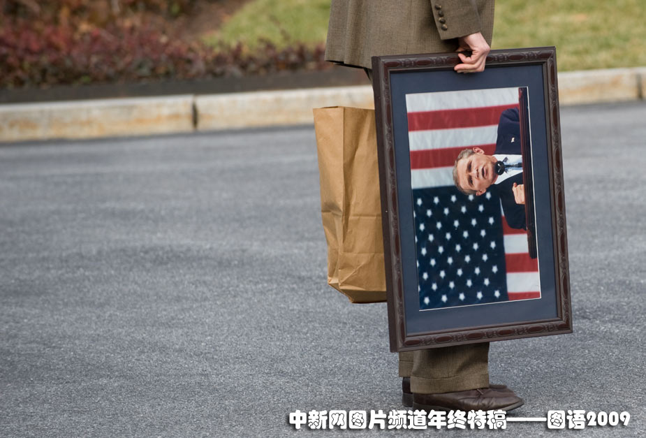 2009年1月17日,一位美國白宮職員在白宮外手持上一任總統(tǒng)小布什的照片。一周前美國新任總統(tǒng)奧巴馬宣誓就職。