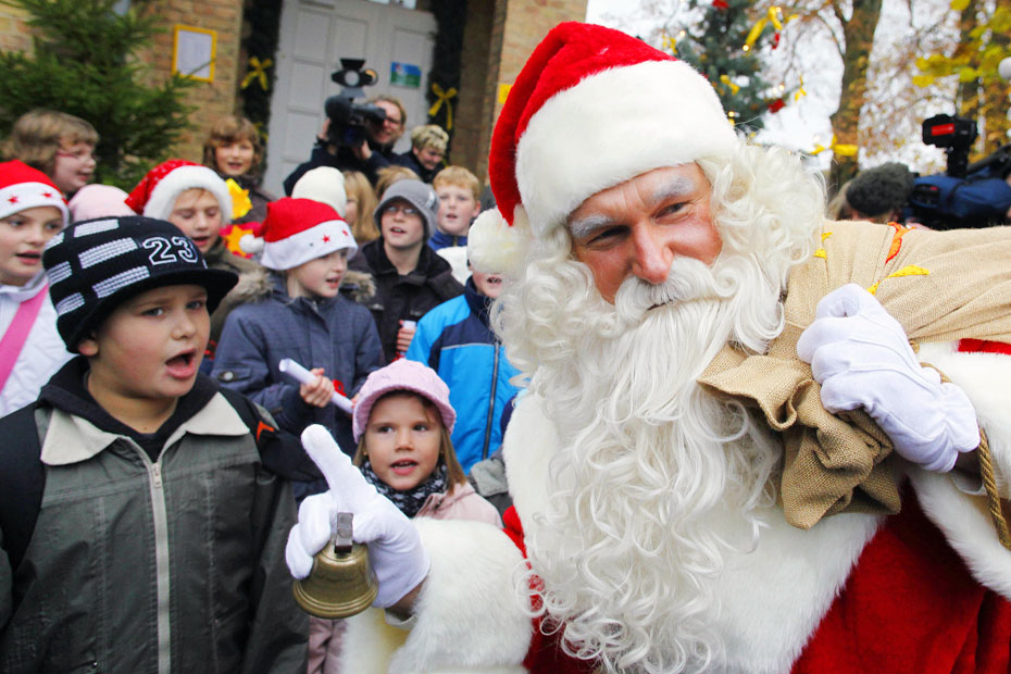圖為德國一名男子打扮成圣誕老人在郵局前與孩子們玩耍。