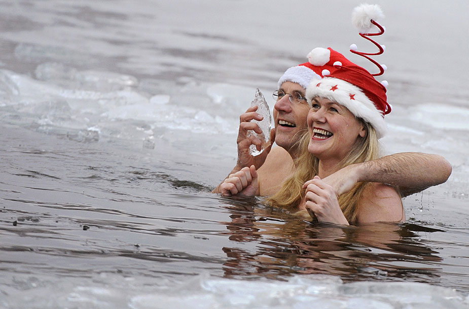 12月25日,德國(guó)柏林的冬泳俱樂部“柏林海豹”(Berliner Seehunde)的成員不畏寒冬,光著身子在已經(jīng)結(jié)冰的Oranke湖中暢游一番。圖片來(lái)源:中國(guó)新聞網(wǎng)