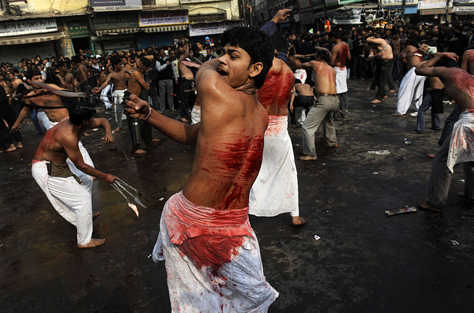 12月28日,印度穆斯林慶祝阿舒拉節(jié)。一些當?shù)啬滤沽衷趦x式上用鐵鞭抽打自己,以此慶祝節(jié)日。圖片來源:中國新聞網(wǎng)