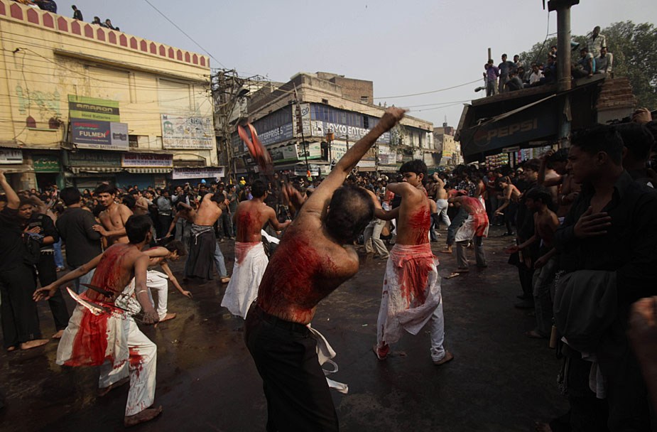 12月28日,印度穆斯林慶祝阿舒拉節(jié)。一些當(dāng)?shù)啬滤沽衷趦x式上用鐵鞭抽打自己,以此慶祝節(jié)日。圖片來源:中國新聞網(wǎng)