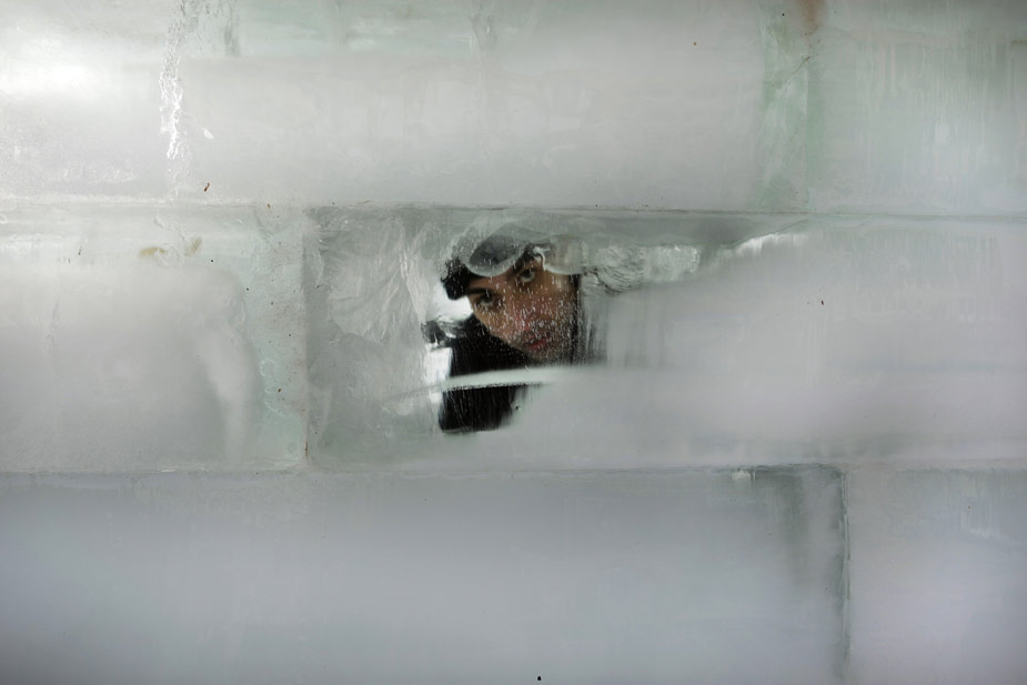 當?shù)貢r間29日早上8點起,以色列魔術師赫齊·達揚在位于特拉維夫的拉賓廣場上,達揚赤身進入一塊8噸重的冰塊里,開始了挑戰(zhàn)冰屋生存世界紀錄之旅。圖片來源:中國新聞網(wǎng)