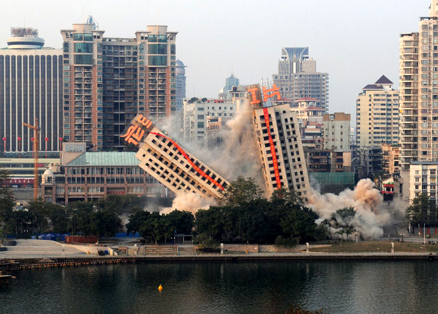12月30日下午,廣西柳州市柳江路一高層公寓將采用爆破方式實(shí)施整體拆除。這幢高層公寓總高22層、66.4米,總建筑面積16422平方米。由于該樓體量較大,為實(shí)施有效爆破,爆破公司在前期用控制藥量爆破的方式把整棟樓從中間“切開(kāi)”,讓一棟樓變?yōu)椤皟蓷潯,再采用控制爆破時(shí)間的方式爆破。這是迄今廣西爆破拆除的最高的單體建筑。但爆破只造成了半棟建筑完全倒下,另一半在傾斜矗立著。柳飛飛/CFP