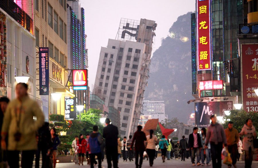 12月30日, 柳州,沒有倒下的半邊樓就像一座斜塔。12月30日下午,廣西柳州市柳江路一高層公寓將采用爆破方式實(shí)施整體拆除。這幢高層公寓總高22層、66.4米,總建筑面積16422平方米。由于該樓體量較大,為實(shí)施有效爆破,爆破公司在前期用控制藥量爆破的方式把整棟樓從中間“切開”,讓一棟樓變?yōu)椤皟蓷潯,再采用控制爆破時(shí)間的方式爆破。這是迄今廣西爆破拆除的最高的單體建筑。但爆破只造成了半棟建筑完全倒下,另一半在傾斜矗立著。顏篁/CFP