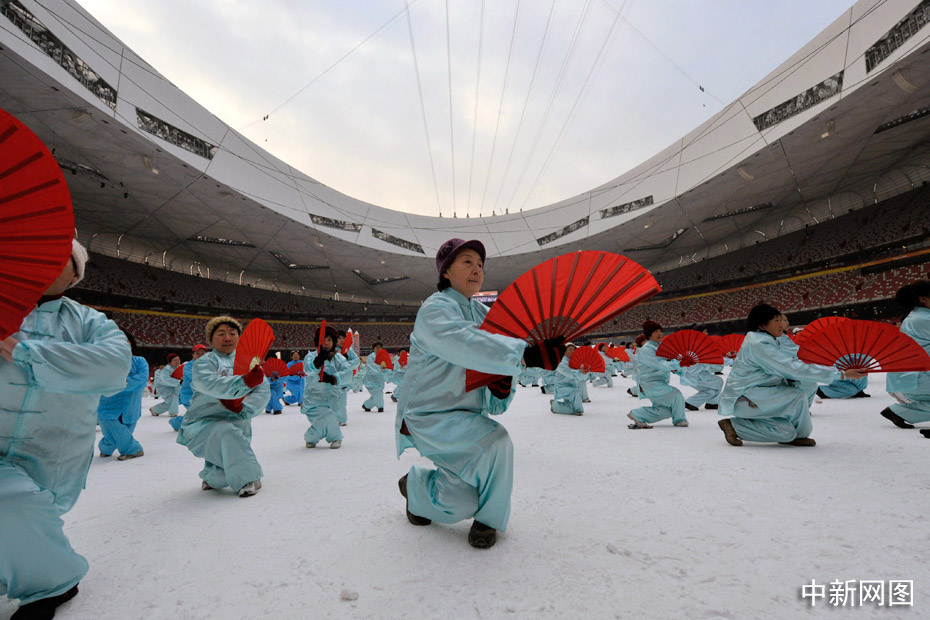 2010年1月1日上午,2010人在被冰雪覆蓋的鳥(niǎo)巢內(nèi)表演了太極拳、武功扇等民族傳統(tǒng)健身項(xiàng)目。中新網(wǎng)記者 金碩 攝