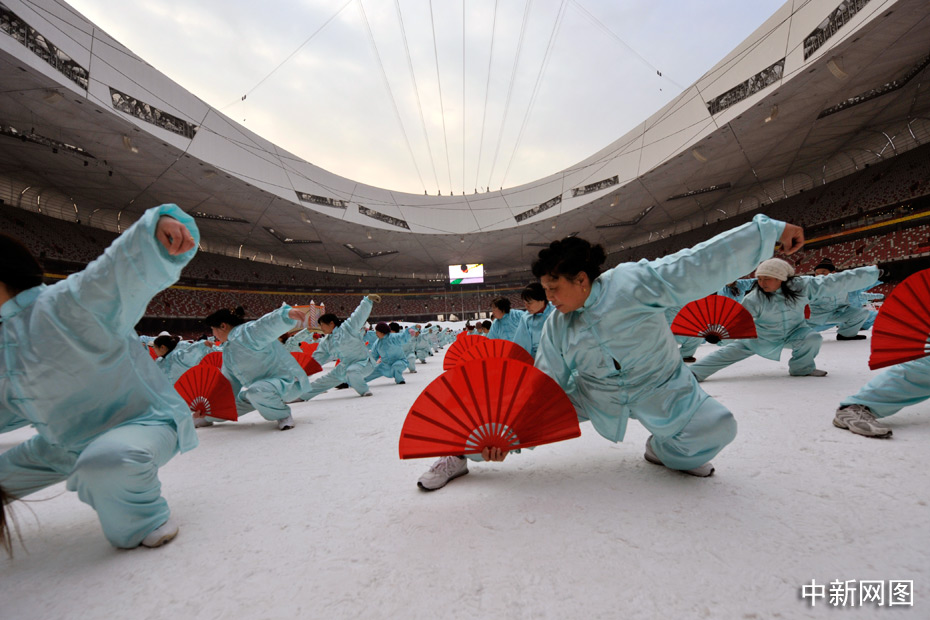 2010年1月1日上午,2010人在被冰雪覆蓋的鳥巢內表演了太極拳、武功扇等民族傳統(tǒng)健身項目。中新網記者 金碩 攝