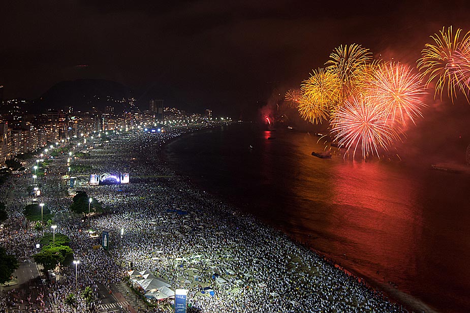 圖為2010年1月1日,巴西里約熱內(nèi)盧的科帕卡巴納海灘燃放煙花,引來大量游客觀看。