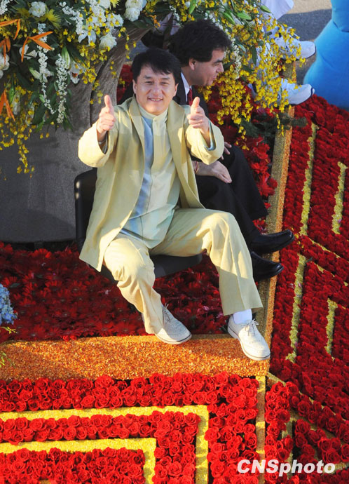 美國當(dāng)?shù)貢r間1月1日,第121屆美國玫瑰花車大游行在加州帕薩迪納市隆重舉行。著名影星成龍助陣中國上海世博花車。圖片來源:中國新聞網(wǎng)