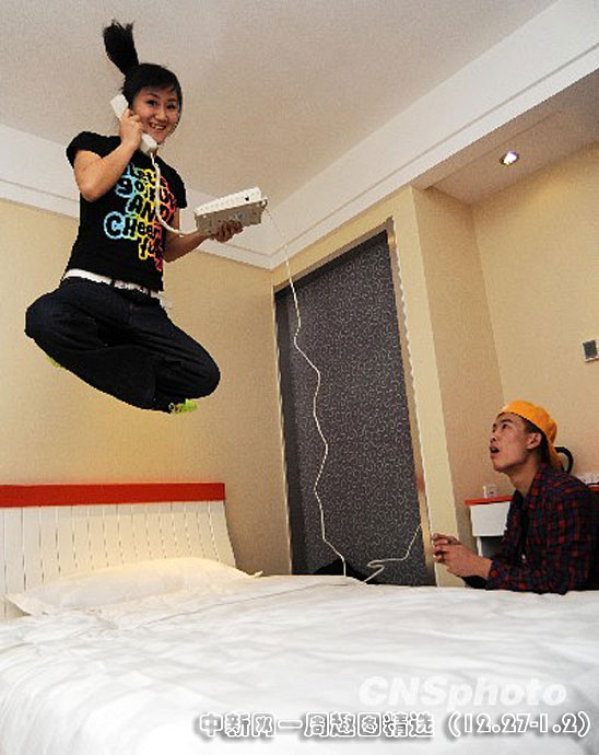 2009年12月26日,山東濰坊年輕人在濰坊一家酒店玩“跳床”。每當周末,山東濰坊“跳床”愛好者就聚集起來玩“跳床”游戲,鍛煉身體,減輕工作壓力。據(jù)活動組織者濰坊領航文化負責人孫志達講,“跳床”從國外流傳而來,能達到鍛煉和減壓效果。目前,在國內(nèi)一些城市,“跳床”受到了越來越多人的歡迎。圖片來源:中國新聞網(wǎng)>>點擊觀看詳細內(nèi)容
